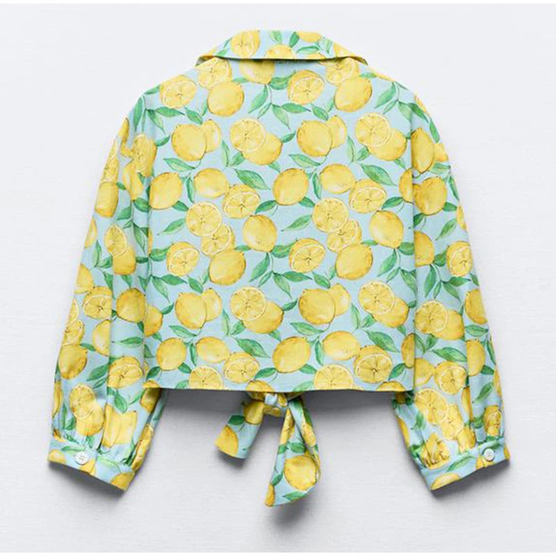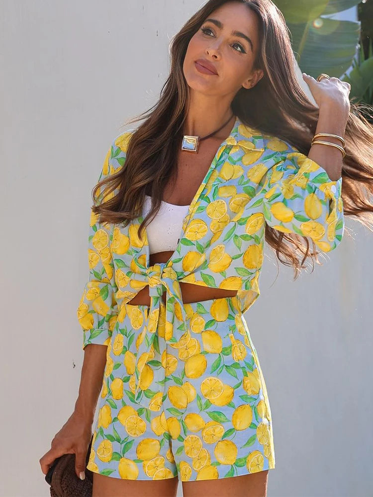 חליפת הלמון הקייצית היא פריט אופנה מרענן ומלא חיים, המושלם לימים חמים ובהירים. הסט כולל חולצה קצרה עם שרוולים תפוחים וצווארון מתקפל, וכן מכנסיים קצרים תואמים. שניהם מעוטרים בהדפס למונים צהובים עליזים על רקע תכלת, היוצר מראה קיצי ומלא שמחה.