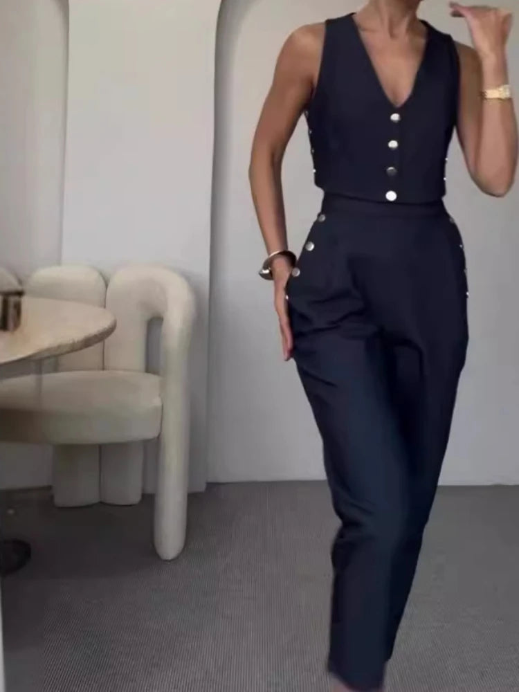 האפודה מתאפיינת במחשוף V מחמיא, ללא שרוולים, עם שורת כפתורים דקורטיביים בצדדים המוסיפים עניין ויזואלי. הגזרה הצמודה מדגישה את קווי המתאר של הגוף ויוצרת סילואט נשי ומחמיא. המכנסיים הארוכים בעלי מותן גבוהה ורגל ישרה, עם כפתורים תואמים לאורך החזית, משלימים את המראה האלגנטי והמסוגנן.