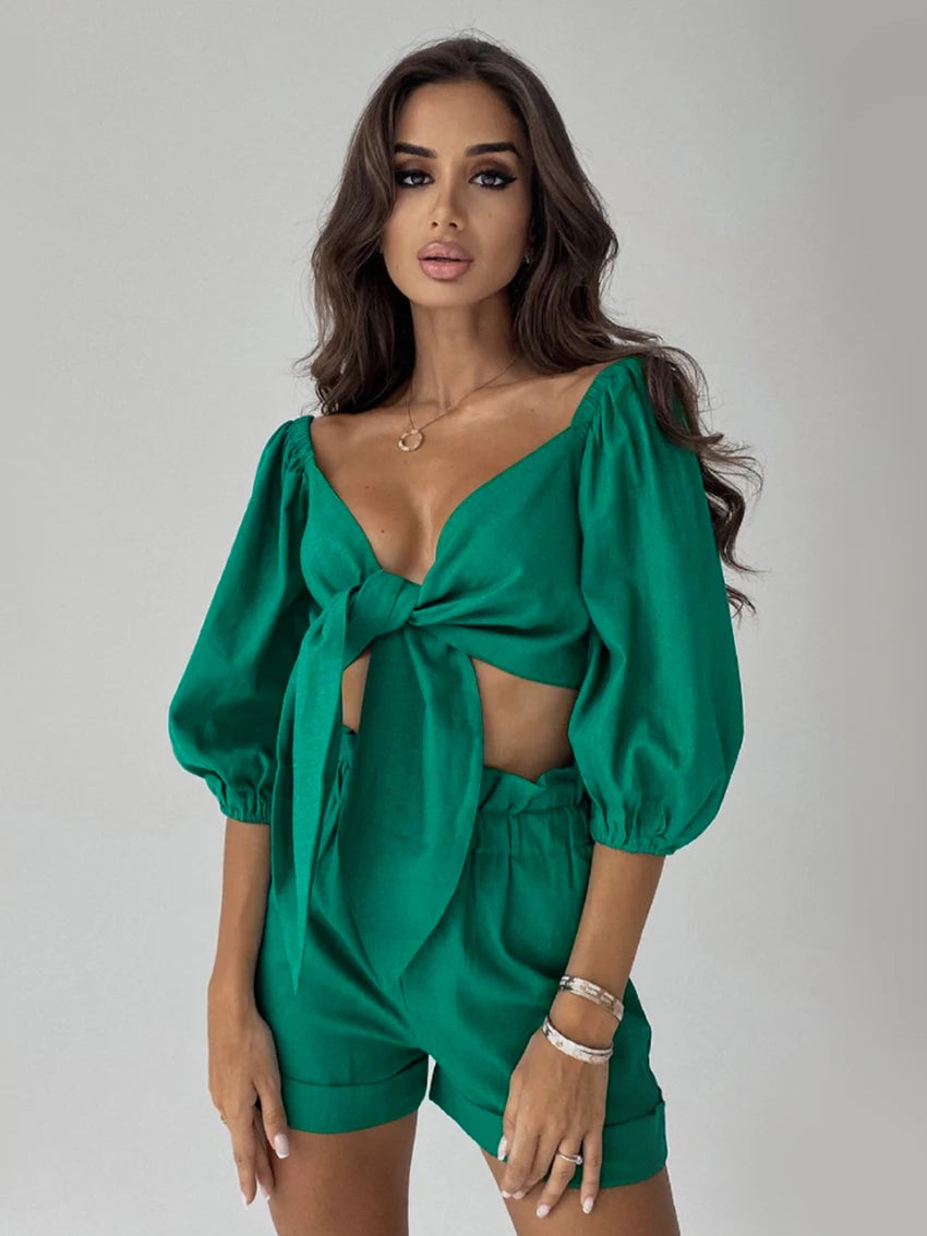 חליפת מכנס RIM היא התגלמות השיק האורבני והסטייל הקיצי המושלם. החליפה מורכבת מחולצת קרופ מרהיבה עם קשירה מלפנים ומכנסיים קצרים תואמים, שיחד יוצרים מראה מתוחכם ונשי. החולצה מתאפיינת במחשוף V עמוק ומחמיא, עם שרוולי פנס (lantern sleeve) מרשימים המעניקים נפח ועניין לחלק העליון. הקשירה המרכזית בחזית החולצה מדגישה את המותניים ויוצרת מראה צעיר ומסוגנן.